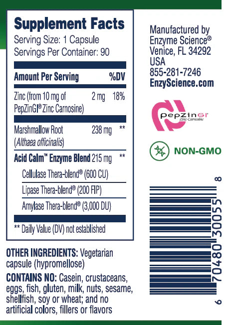 Acid Calm™ provides relief for occasional heartburn and indigestion, while also providing long-term support for GI system function.* PepZinGI® zinc carnosine helps protect the mucosal lining, acting as a barrier for stomach acid.
